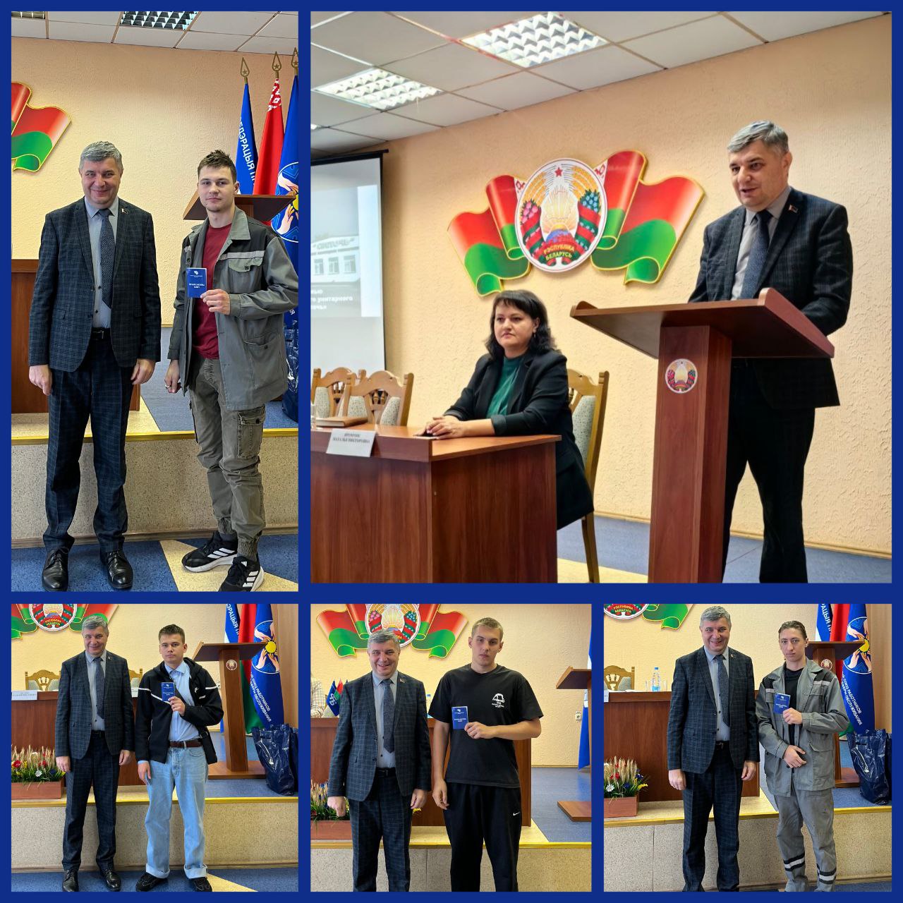 В завершении мероприятия Владимир Торгоня вручил молодым специалистам, прибывшим на предприятие "Светочь" в августе этого года профсоюзные билеты, и поздравил с вступлением в члены профсоюза.
