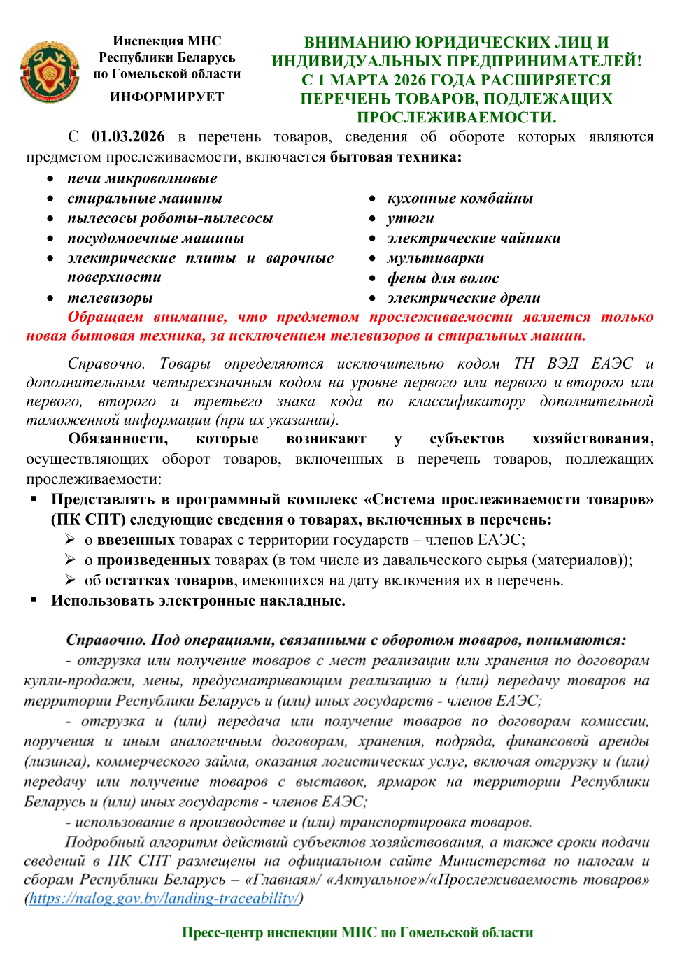 Вниманию юридических лиц и индивидуальных предпринимателей! С 1 марта 2026 года расширяется перечень товаров, подлежащих прослеживаемости